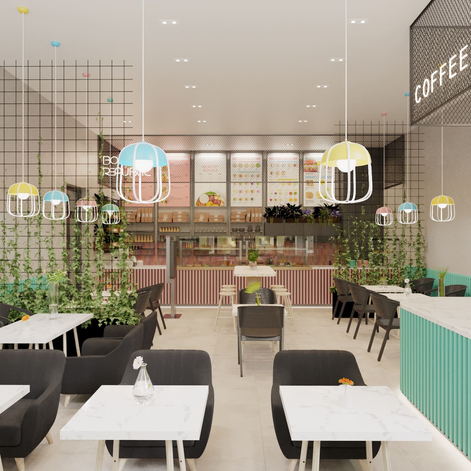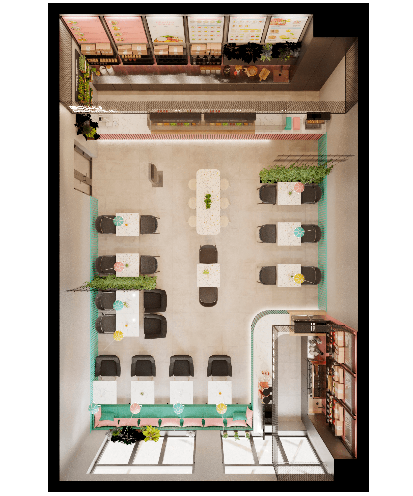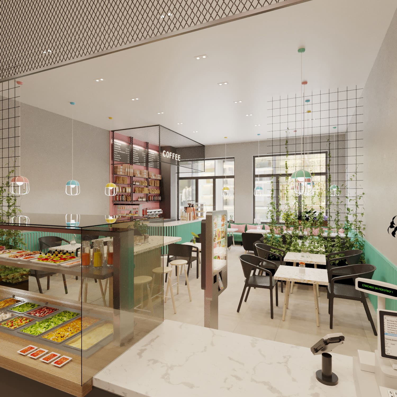 After developing the brand book, we set about designing the interior of the establishment. We prepared drawings and sweepings and developed a 360° rendering.