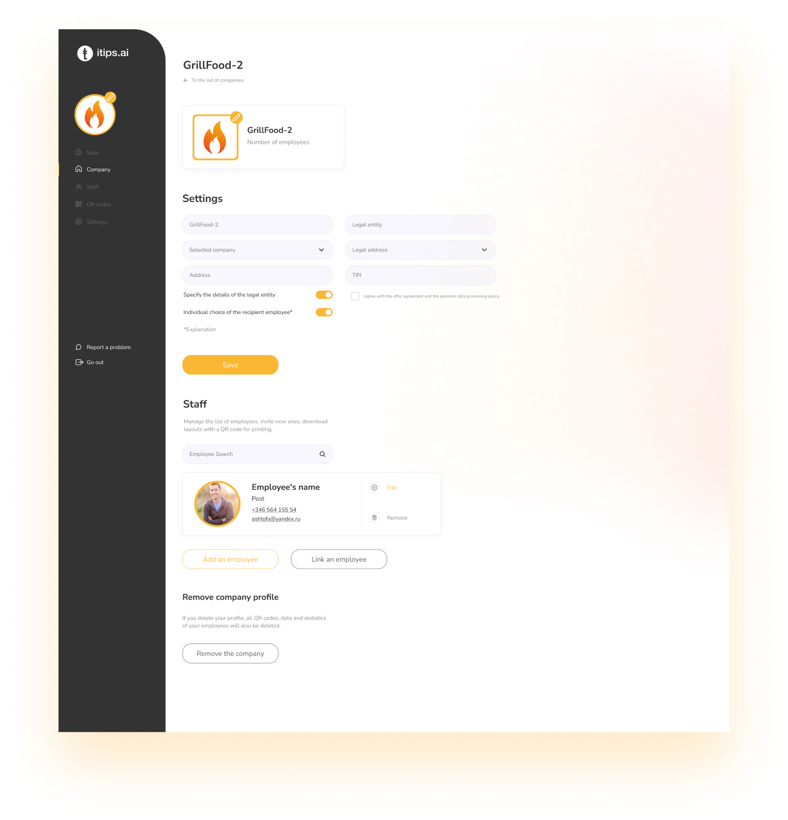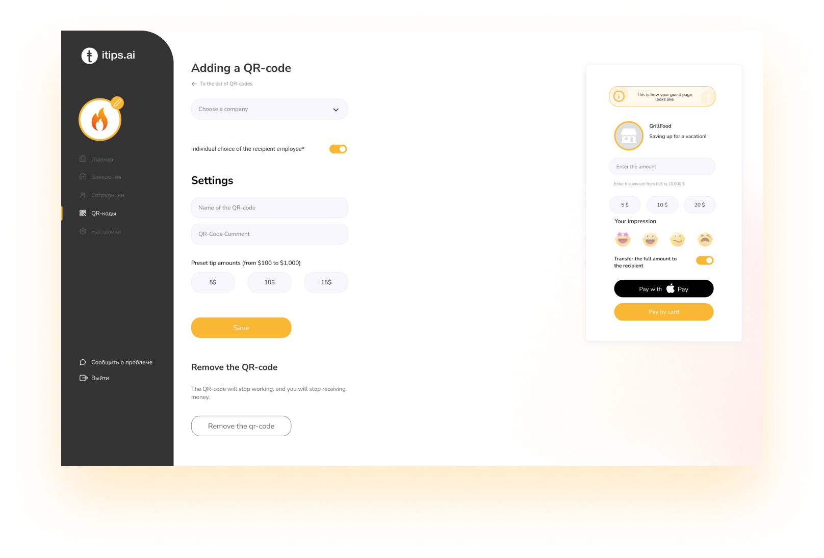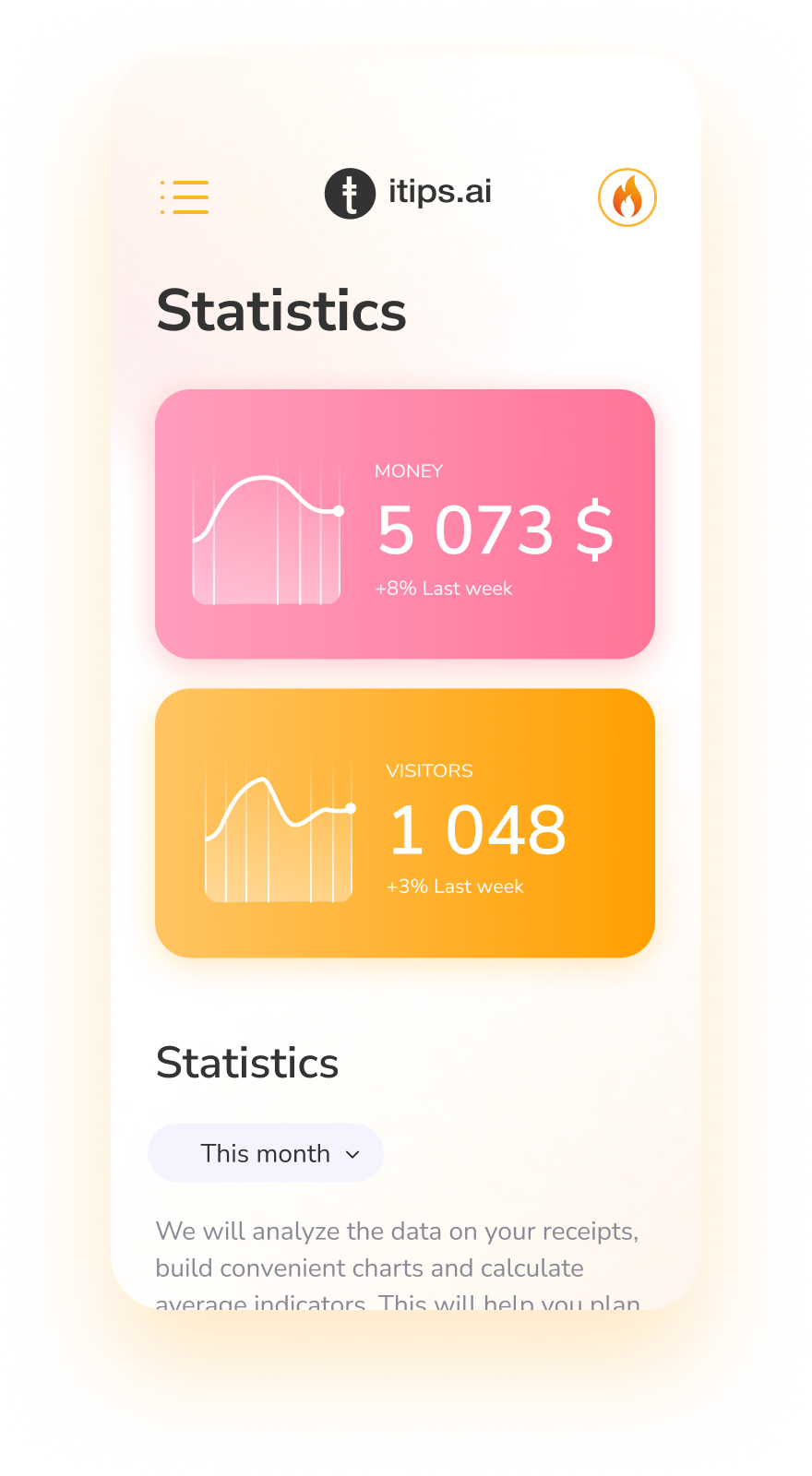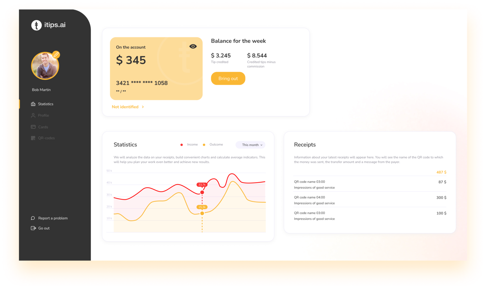 iTips.ai is a tipping service that helps businesses conveniently distribute the establishment's income to employees, study statistics and improve service. The platform is also designed for musicians, bloggers, small businesses, and large corporations to generate additional income online.